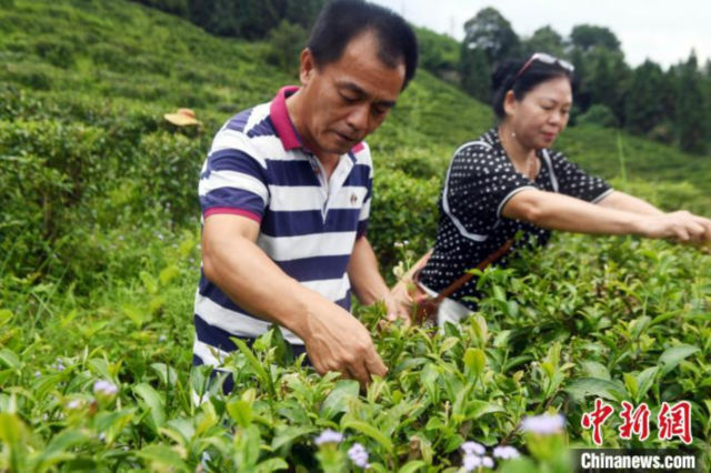楊旻倫與妻子賴莉芳在茶葉種植基地采摘茶葉 蔣雪林 攝