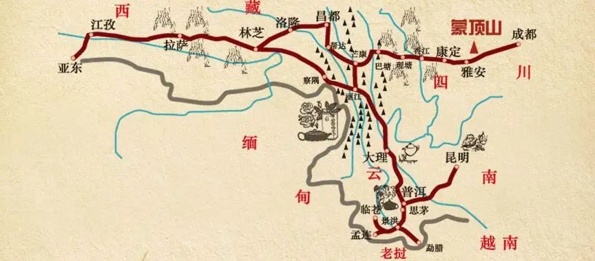之后,順其自然地就出現(xiàn)了滿足這種貿(mào)易形式的貿(mào)易通道。古代交通方式有限,“馬幫”就成了為交換“馬匹”和“茶葉”貿(mào)易提供服務(wù)的運(yùn)輸商。隨著“茶馬互市”規(guī)模的擴(kuò)大,一條條古道被相繼探索發(fā)展出來(lái),隨著歷史的發(fā)展,人們逐步將這些道路統(tǒng)稱為了“茶馬古道”,一個(gè)聽(tīng)起來(lái)還有點(diǎn)浪漫的名字。
