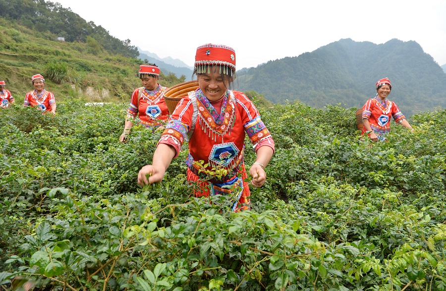 上午9時,7位身著土家族傳統服裝的婦女,有說有笑地在莓茶園里采摘莓茶。