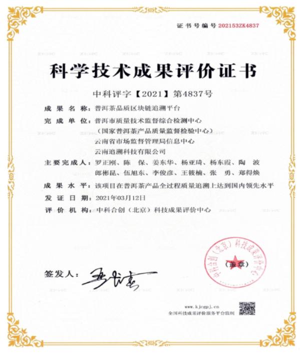 日前,第三方專業(yè)科技成果評價機構(gòu)依據(jù)科技部《科學技術(shù)評價辦法》,組織同行專家對國家普洱茶產(chǎn)品質(zhì)量監(jiān)督檢驗中心完成的“普洱茶品質(zhì)區(qū)塊鏈追溯平臺”項目科技成果開展評價。