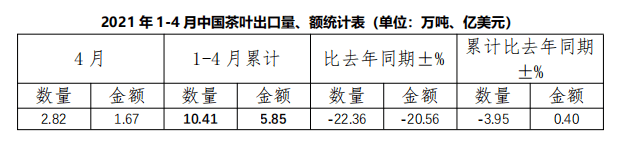 2021年1-4月,中國茶葉累計(jì)出口量為 10.41萬噸,同比減少3.95%,出口額為5.85億美元,同比增長0.40%,1-4月出口均價(jià)為5.62美元/千克,比去年同期上漲4.54%。